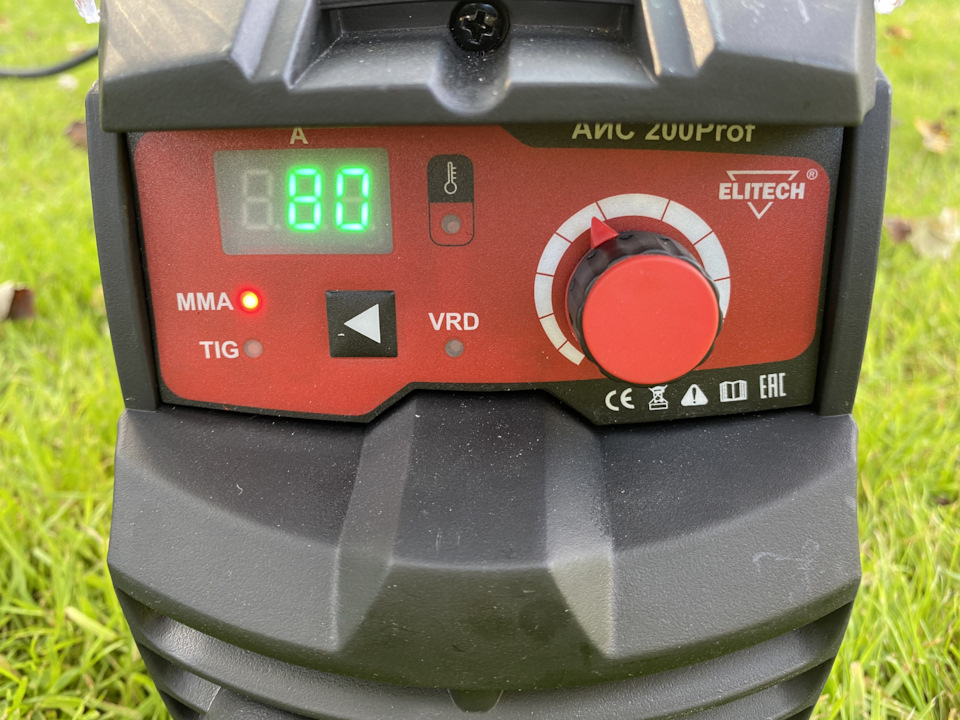 Панель управления — есть только регулировка тока, на профи же аппаратах 3 ручки регулировки — сила тока, форсаж дуги, и регулировка горячего старта