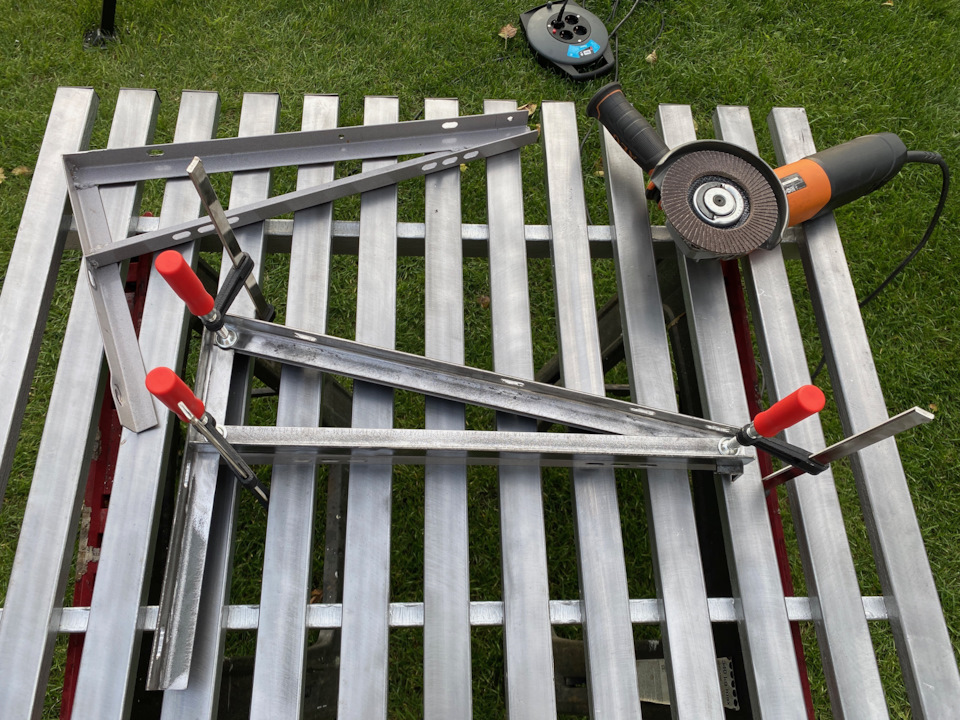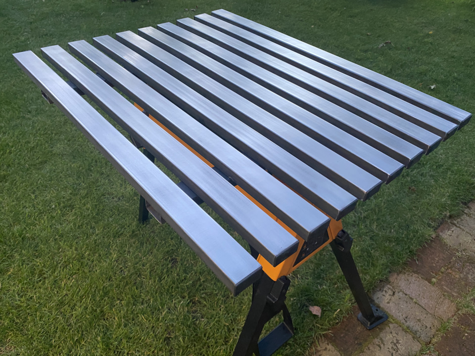 Я бы купил такой стол непременно, но оставлять такой на улице жалко, а просторной мастерской под крышей в не боящемся искр помещении у меня пока нет, поэтому я для начала решил изготовить небольшой столик из профиля, причем задумка была такая, чтобы это был не стол с ножками, а только столешница, которую легко убрать, она не занимает много места, но в любой момент ее можно достать и зажать в тиски Triton SuperJaws.