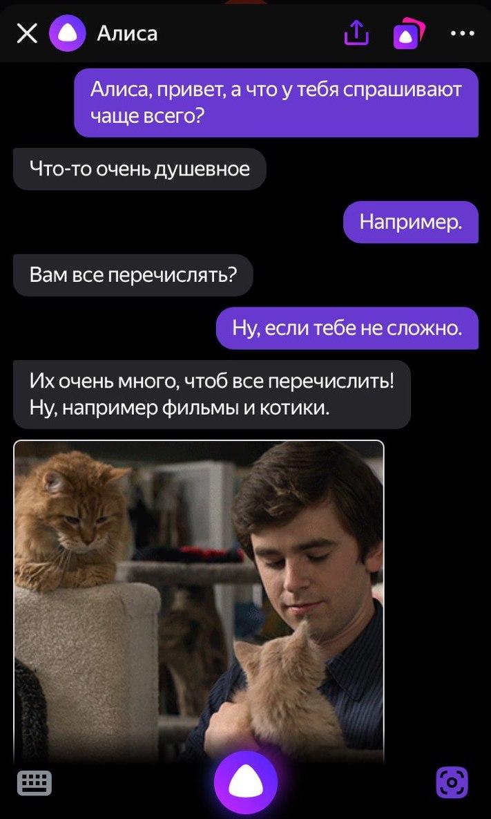 Так, на вопрос о том, чем пользователи интересуются чаще всего, Алиса назвала две просьбы: фильмы и котики.