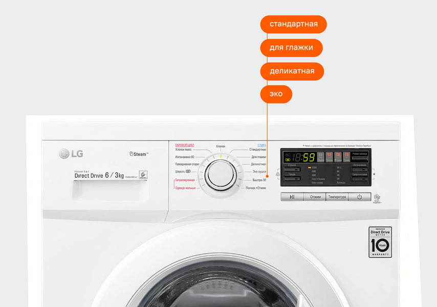 - 10 режимов, включая программы «Шерсть», «Деликатная», «Детская одежда», «Смешанные ткани», «Быстрая», «Подача пара» и «Предварительная»;