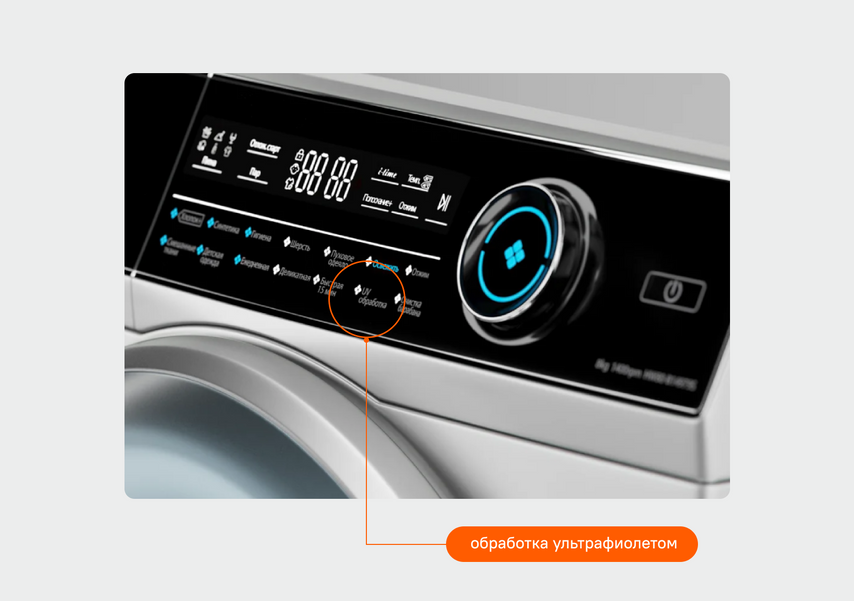 Обработку ультрафиолетом можно добавлять к основной программе стирки. По словам производителя, она убивает бактерии, грибок и плесень в машинке. В том числе те, что живут между барабаном и корпусом.