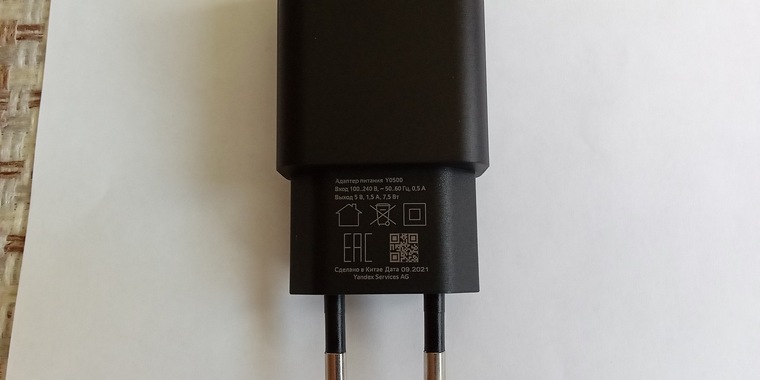 Сверху надпись яндекс, снизу надписи сделано в Китае, серийный номер, дата производства, питание.