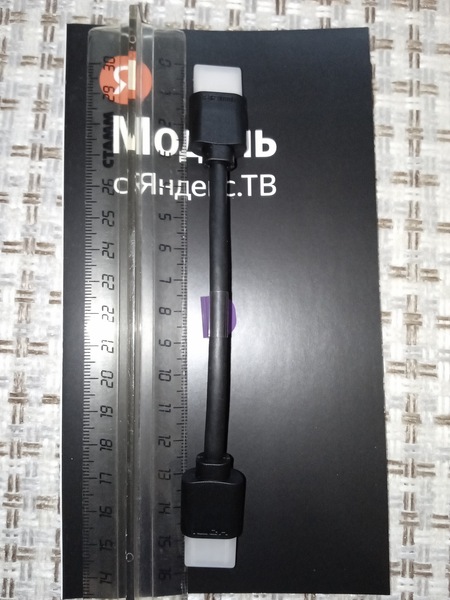 Кабель hdmi 15,7 см, будьте внимательны очень короткий, если вам нужен кабель большей длины можете смело докупать, у меня работает отлично с кабелем hdmi длиной 1,5м (по цене не больше 200р).