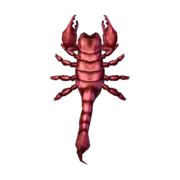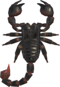 The Scorpion is a bug in the Animal Crossing series introduced in Animal Crossing: Wild World. Like the Tarantula and Wasp, they are hard to catch as well as harmful, but will only attack a player if they are holding a net. If startled by rapid movement (whilst holding the net), it will sting the player, which causes the player to faint and re-awaken outside of their home, though with no other status effects upon awakening, or the dock next to Wilbur or Kapp’n on a Mystery Island or boat tour island respectively. However, if the player is not holding a net, the scorpion will run away and eventually disappear. In Animal Crossing: New Horizons, if a villager is near a scorpion, they will stop what they were doing, display the shocked reaction, then stare at the scorpion using the intense reaction until it despawns. If the player successfully catches one, the villager will display a sigh of relief using the sighing reaction, than return to what they were doing. The same applies to the tarantula.