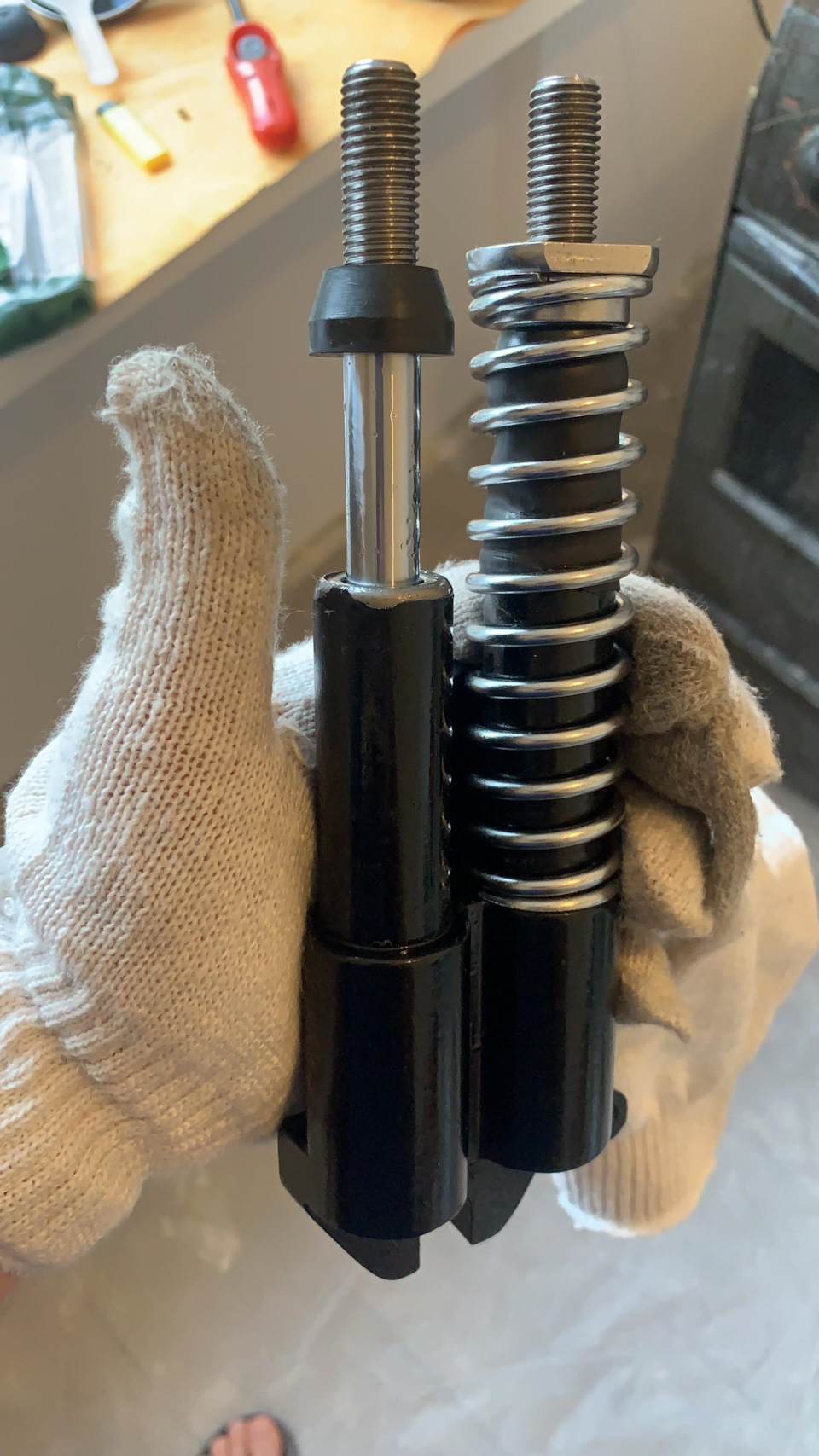 И немного расстроился. Так как аморты сухие, от слова совсем… Да и шток ходит весьма свободно, они в отличии от предыдущих даже разбираются… Но залить туда масло увенчалось не лучшей идеей так как оно сразу вытекло через шток…