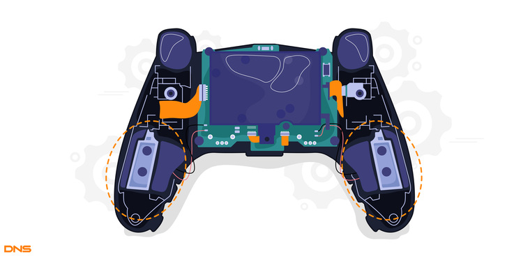 Сама кнопка триггера работает точно так же, как в DualShock 4. В ее основе все так же лежит аналоговой датчик Холла. Это не простое включение / выключение функции или действия, а довольно точное, филигранное регулирование и управление ей. Ведь датчик Холла четко отслеживает глубину нажатия курка и незамедлительно передает информацию о ней в центральный процессор консоли. Более подробно о работе датчиков DualShock 4 рассказано в статье клуба DNS.