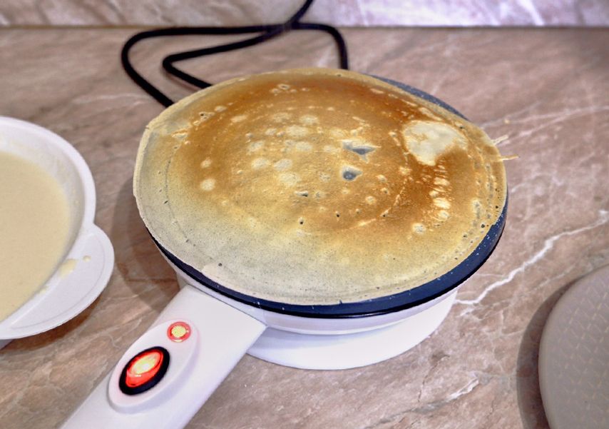 Качество блинов. На блиннице получаются золотистые эластичные блины толщиной примерно 3 мм. Края не пересушиваются и не ломаются. В такие блины удобно заворачивать начинку. Можно выложить ее в центр, свернуть блин конвертиком и обжарить с двух сторон, чтобы запечатался. За качество блинов — 5 баллов.
