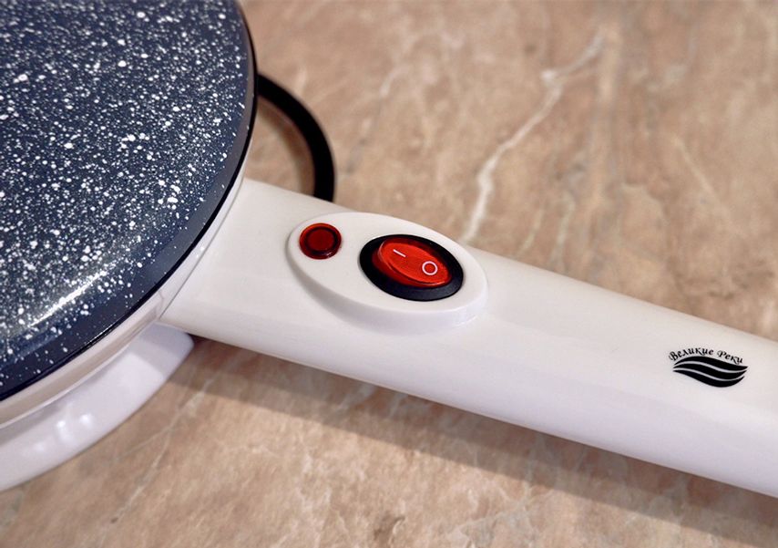 Недорогой прибор из Турции. Большая часть его из пластмассы не лучшего качества. Поверхность для жарки напоминает обработанный камень. Все же хоть видели, как мастера восточной кухни готовят на каменных печах лепешки? Вот здесь тот же принцип работы. Камень нужно смазать маслом. Подойдет любое, даже пальмовое. Дальнейший принцип работы уже нам знаком: тесто наливается в специальную плошку, окунаете туда сковороду и все прилипает. Можно экспериментировать с рецептами и делать не только блины, но и лепешки или подобие лаваша. Подойдет для приготовления жирных турецких лепешек гёзлеме. Если у вас есть форма для печенья или другие жаропрочные выемки, можете разбить туда яйцо и запечь. Главное неудобство связано с сетевым шнуром. Во-первых, он короткий, хоть производитель заявляет о длине в метр. Фактически он раза в два короче. Во-вторых, выступает из ручки, то есть везде следует за вами.