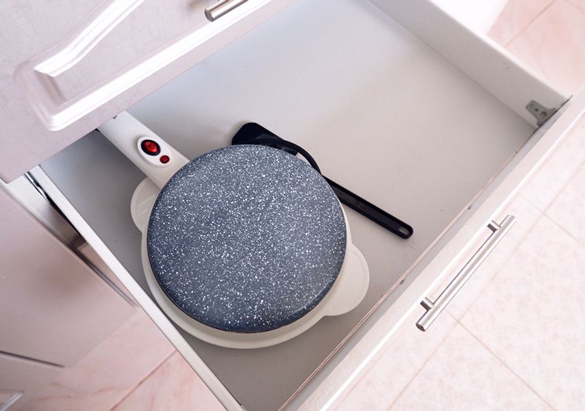 В ящике кухонного гарнитура блинница занимает очень мало места. По обоим параметрам (уход и хранение) — 5 баллов.