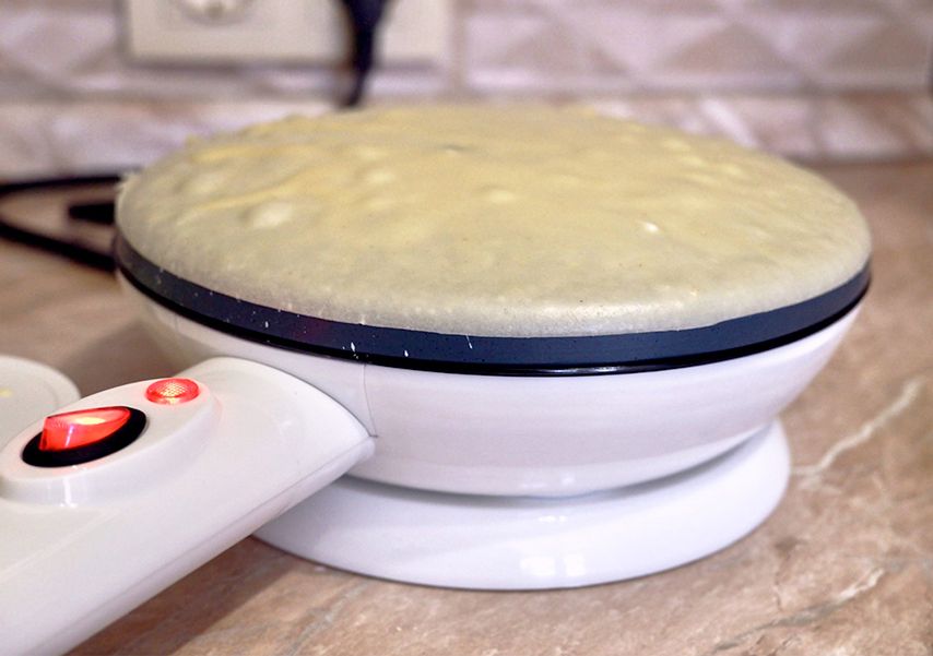 Поверхность блинницы нельзя смазывать маслом, иначе тесто не прилипнет. Но смазывать и не требуется: поверхность антипригарная, а масло есть в составе самого теста.