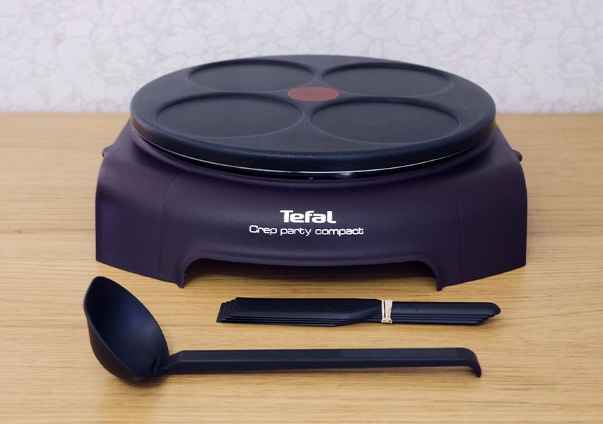 Tefal PY303633 — на антипригарной платформе есть четыре круглых выемки диаметром 12 см для небольших блинчиков. В комплекте — половник объемом на один блинчик плюс четыре лопатки. Подробнее мы рассказывали об этой блиннице в другом материале .