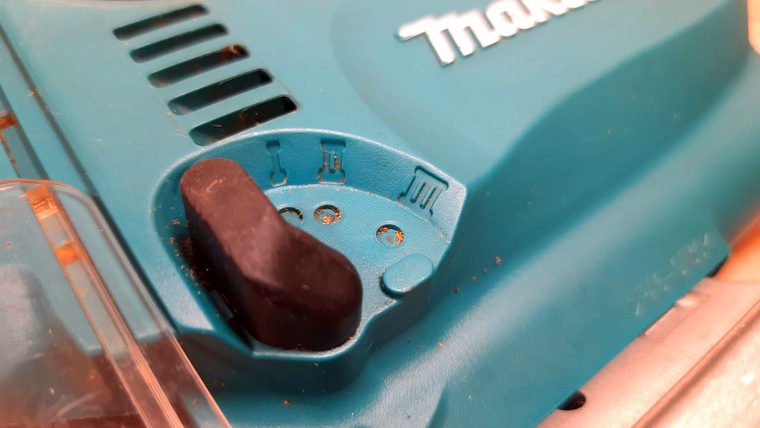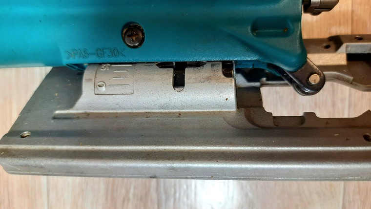 Переключатель имеет шесть положений и изменяет пропорционально частоту хода полотна пилки от 500 на первом положении переключателя до 3100 на шестом. Для эффективного пиления древесины, достаточной частотой хода, по многим источникам, считается 2500, а вот для пиления металлов частоты в 3100 ходов будет достаточно только впритык. К тому же, длительное пиление металла на максимальной скорости создает угрозу перегрузки двигателя.