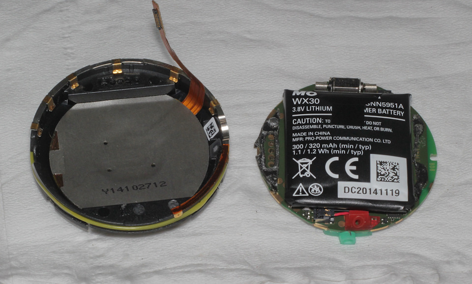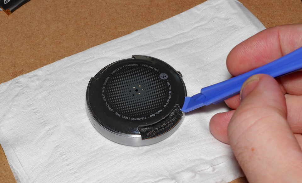 Как разобрать часы есть много видео в интернете, достаточно набрать фразу " moto 360 replace battery ". Смотрим и разбираем. Нужно снять пластиковую крышку, она сидит на двухстороннем скотче, и сидит достаточно крепко, а сама крышка достаточно хлипка. В интернете много фото этих сломанных крышек, поэтому снимал очень аккуратно. Во первых опыта не было, во вторых надо греть феном крышку и не перегреть постараться и не прилагать усилий на изгиб, иначе крышка треснет.