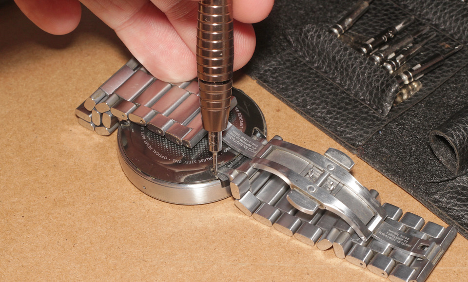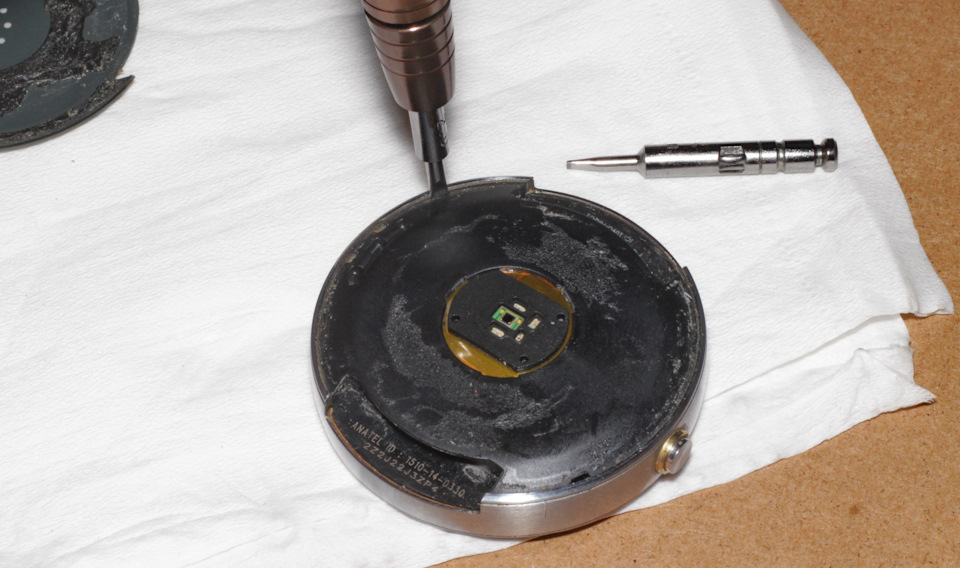 Блок часов сидит в корпусе, блок нужно снять. Есть четыре точки по краям корпуса, которые нужно поддеть и блок из корпуса выйдет. Делать нужно очень очень равномерно и синхронно иначе заклинит: