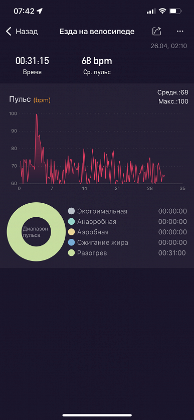 Во-первых, единственные параметры, которые показываются — пульс и продолжительность. Почему-то ни расстояние, ни скорость, ни прочая статистика не фиксируются (или же мы не нашли, как сделать так, чтобы всё это фиксировалось, но в этом случае непонятно, почему нельзя это сделать по умолчанию).