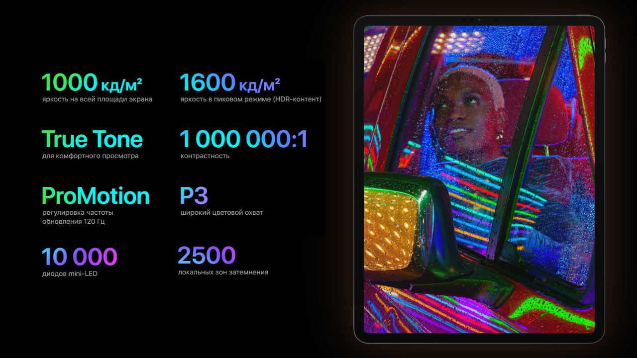 Ещё одно приятное нововведение iPad Pro 2021 – это скоростной порт Type-C, который поддерживает USB 4.0 и Thunderbolt 3 и позволяет передавать данные со скоростью до 40 Гбит/с. Как и прежде, планшет поставляется в нескольких цветах, а объём памяти варьируется от 128 ГБ до 2 ТБ. Версии с поддержкой сотовых данных получили 5G и возможность использования eSIM.