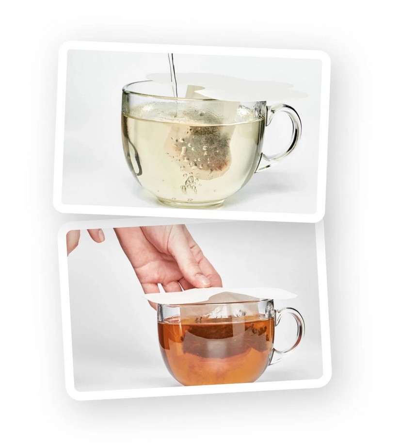 - с картонным держателем (удобно раскладывается на краю чашки и выступает в качестве крышки).